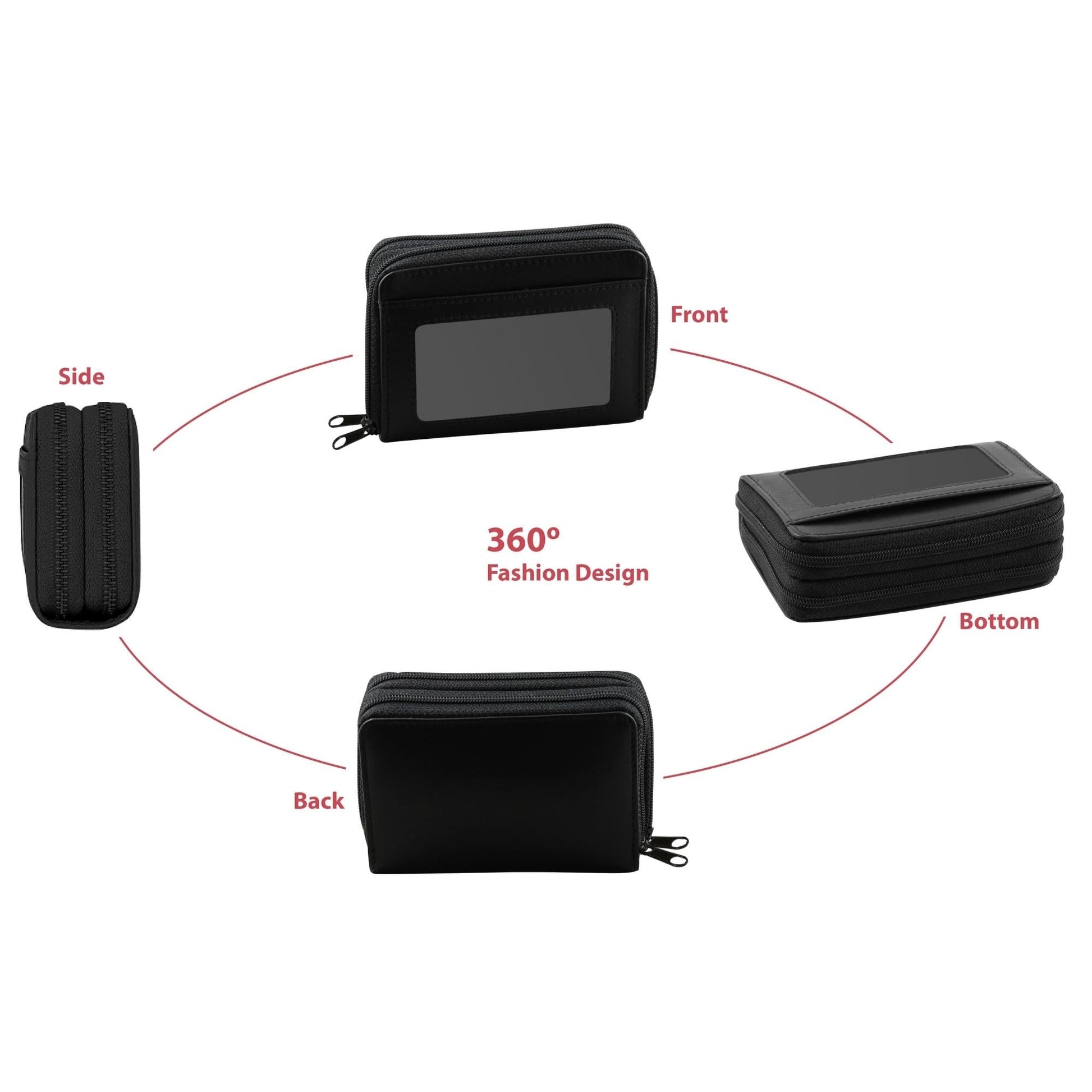 Perfect Size to Organize Almost Everything: 4.25 x 3.25 x 1.5 inches. The small card wallet fits in your hand, pocket or purse. There are two zipper compartments , One 10-card slots for cards, Seondly, 2 wide slots for bills, coins , tickets, receipt etc . In addition ID Display for each use